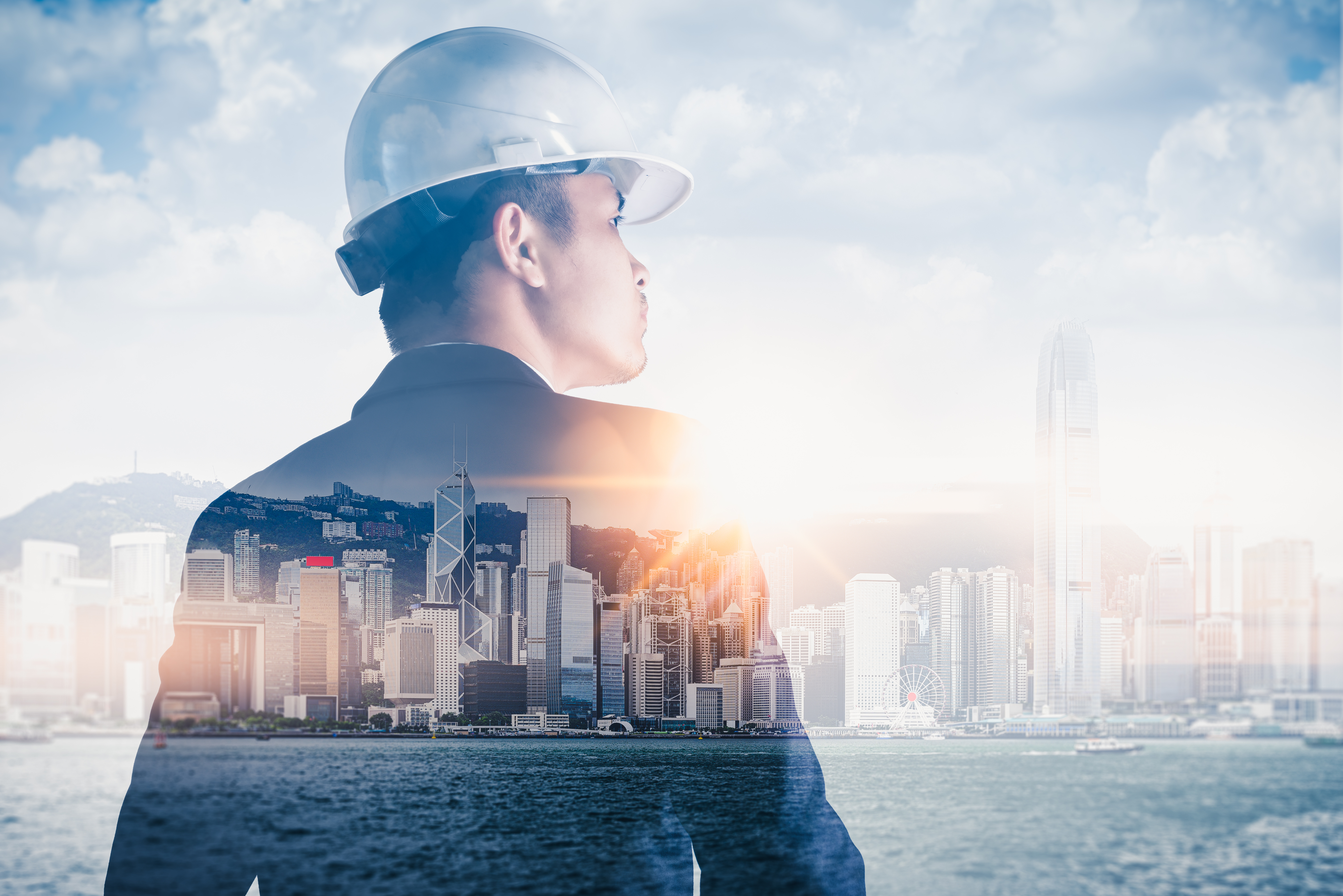 The double exposure image of the engineer standing back during s